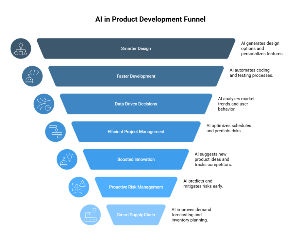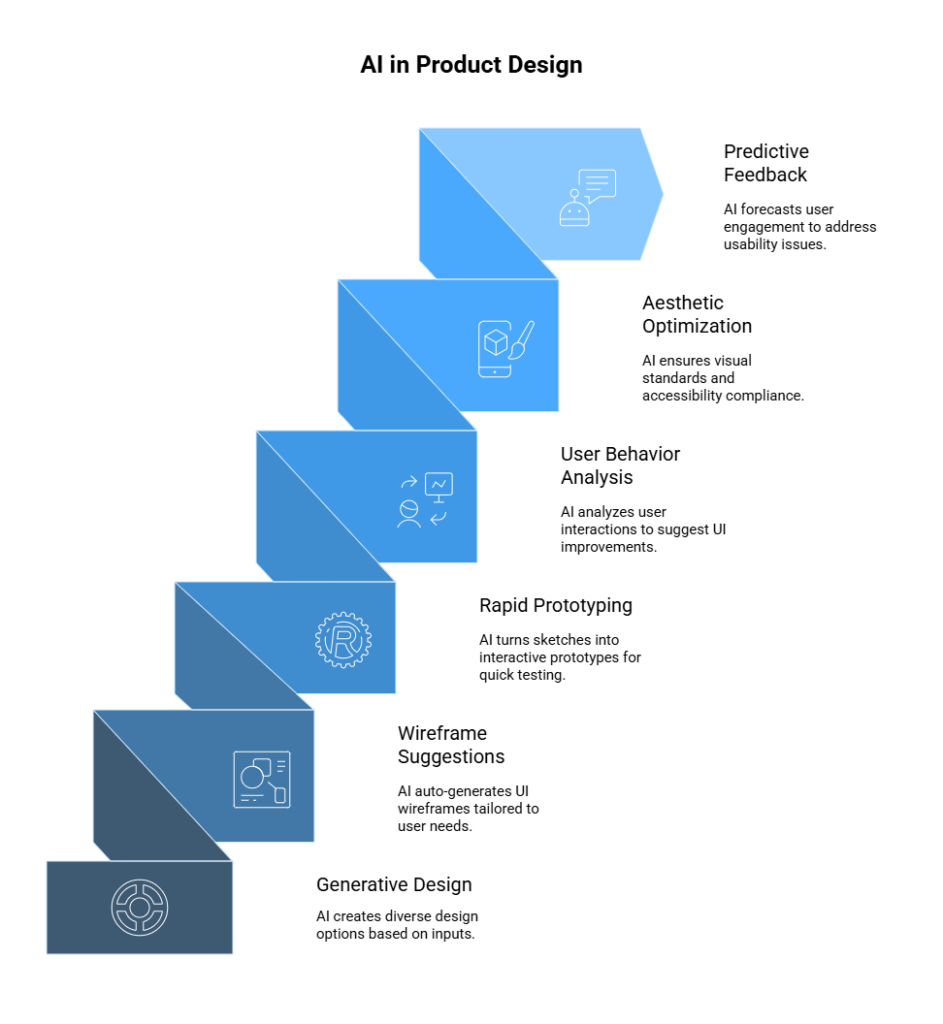 Let us consider a closer view of AI in product development across design, prototyping, process optimization, testing, decision-making, and innovation.
