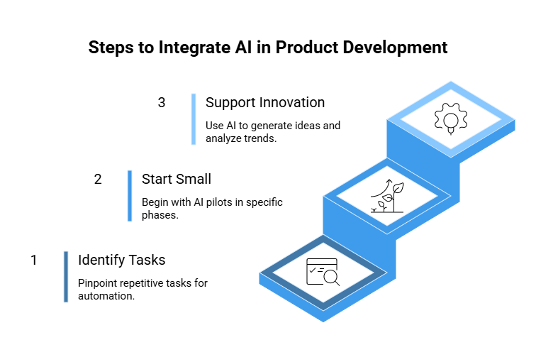 The first step is to identify those repetitive and time-consuming steps in your product development that add little to nothing from a strategic perspective. Such processes could include data entry, manual testing, sorting through customer feedback, and even elementary prototyping. Automate those aspects with AI applications such as NLP for sentiment analysis or generative design software, thereby freeing the product teams to undertake more creative, high-impact work. This is probably the best way to initiate AI applications into product development without an overwhelming restructuring of workflows.