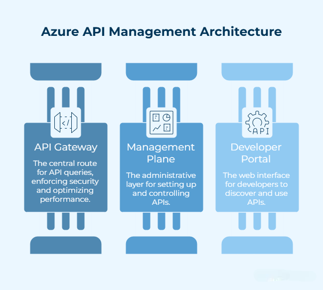 Three main components form the Azure API management architecture. They work together to manage, secure, and publish APIs.