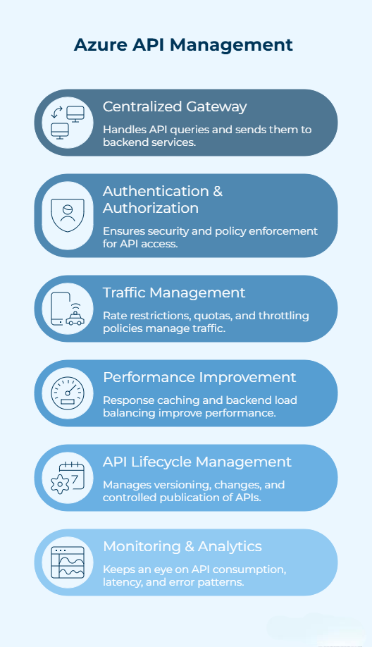 Azure API management is a safe way for API users to connect to backend services. It handles API requests, makes sure policies are followed, sends traffic to backend systems, and monitors performance through a single platform.