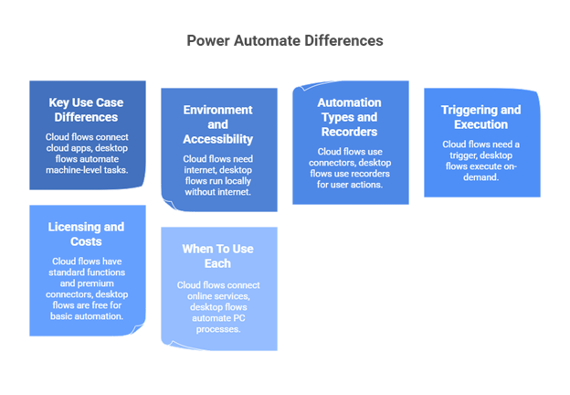 A Cloud flow always needs some sort of trigger in order to start the process, which may be automatic, scheduled, or manual. On the other hand, the execution of desktop flows does not require any trigger, and that very fact brings additional flexibility; it is tailored for tasks that a user does sometimes but wants to automate for efficiency.