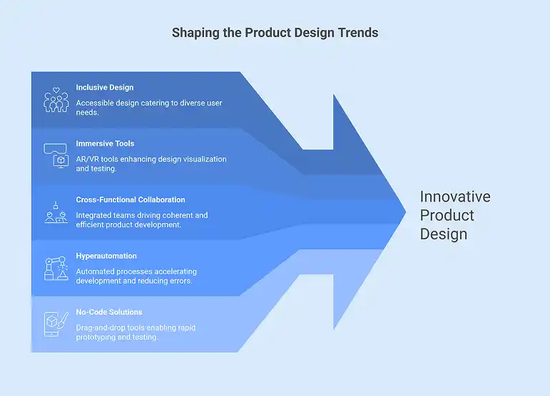 Understanding product development trends fosters competitiveness by adapting to changing technologies, consumer behaviors, and market dynamics. Trends such as hyper-automation, AI integration, and cross-functional collaboration help companies with faster innovation processes while saving on cost and risk.